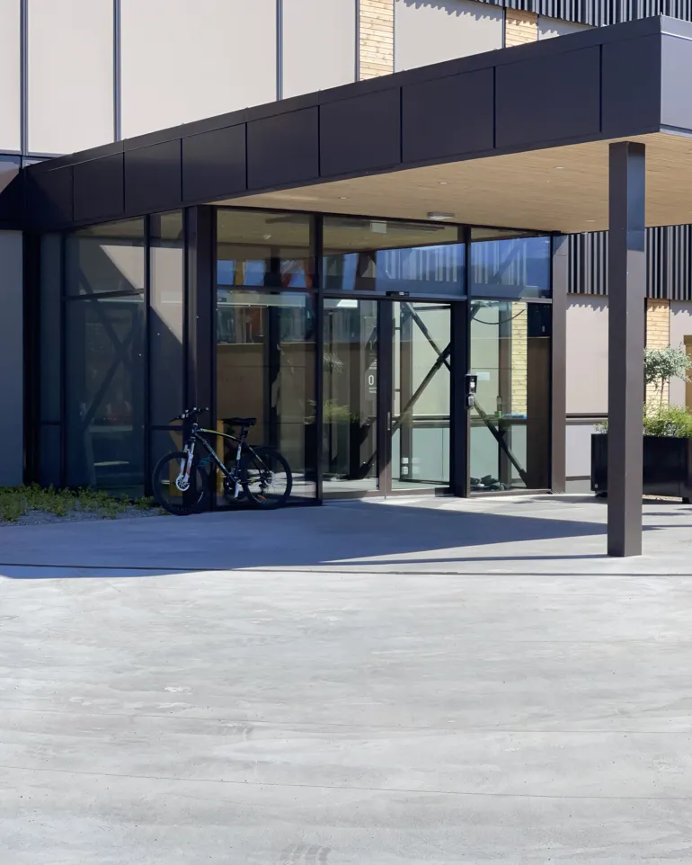 Hovudinngangen ligg i Svanehaugvegen 6, på sørsida av Dagabygget.